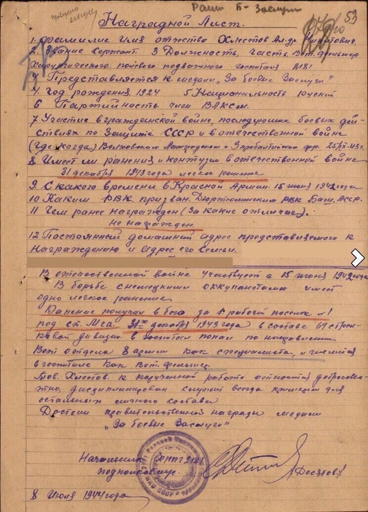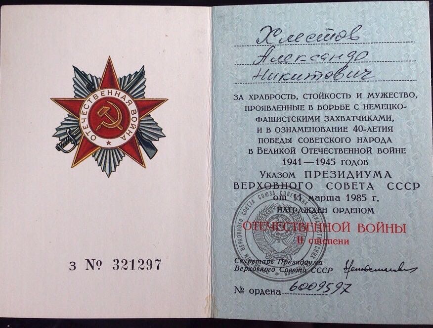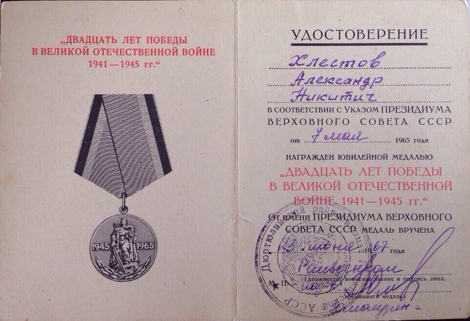 Сержант Хлестов Александр Никитович 1925 года рождения был призван в ряды Красной армии 15 июня 1942 года. Воевал на Волховском, Ленинградском и 3-м Прибалтийском фронте. 31 декабря 1943 года получил ранение. Награжден орденом «Отечественной войны II степени», медалями «За боевые заслуги», «За освобождение Праги», «За победу над Германией».