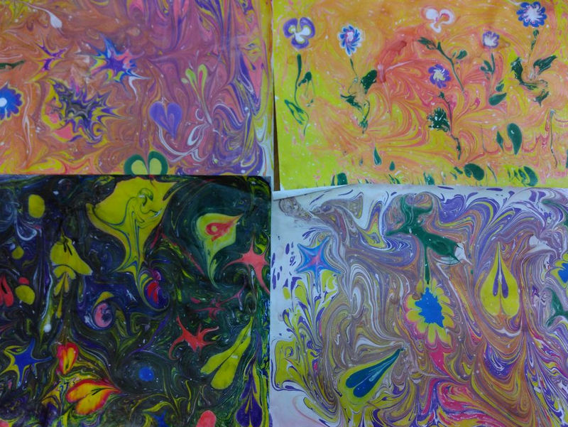 Дети-инвалиды района учились рисовать в технике «Эбру», которая берет начало на Востоке. Она предполагает, что картины на бумаге создаются при помощи специальных экстрактов растений и желчи.