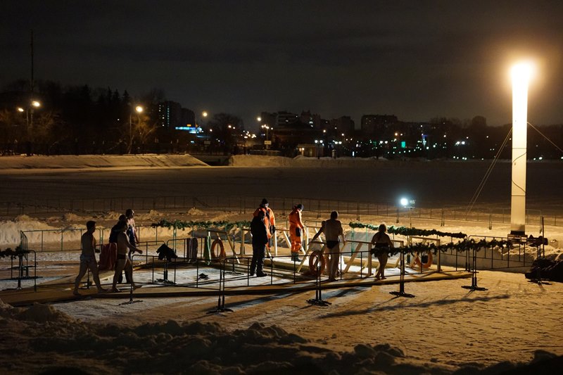Оборудования купель начала работу в 18 января 18:00, а прекратились купания только в полдень 19 января. На причале лодочной станции для верующих организовали целый комплекс с безопасными коридорами, перилами и впуском в воду.