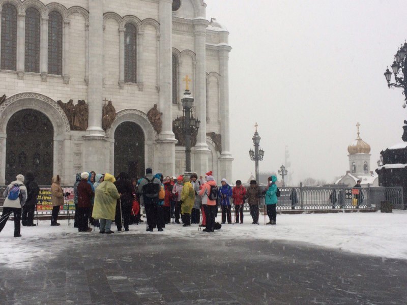 На «Кропоткинской» мы встретились с другими «пилигримами» — их собралось около 40 человек. Замелькали яркие шапки, а из «колчанов» за спинами показались палки.