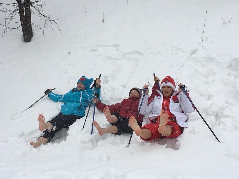 На конечной точке маршрута, около станции метро «Воробьевы горы», все угощаются припасенным горячим чаем и бутербродами, а Елена Калмыкова – тренер клуба «Синица» — и Ирина Голоднюк бегают по заснеженному склону босиком.