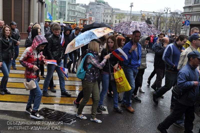 Разноцветные колонны под праздничные лозунги прошествовали по Красной Площади до Государственного исторического музея. С трибун раздавались поздравления с праздником Весны и Труда.