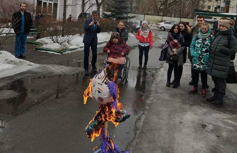 Завершением праздника стал традиционный обряд сожжения чучела Масленицы, которое принес один из студентов. Все попрощались с долгой холодной зимой.