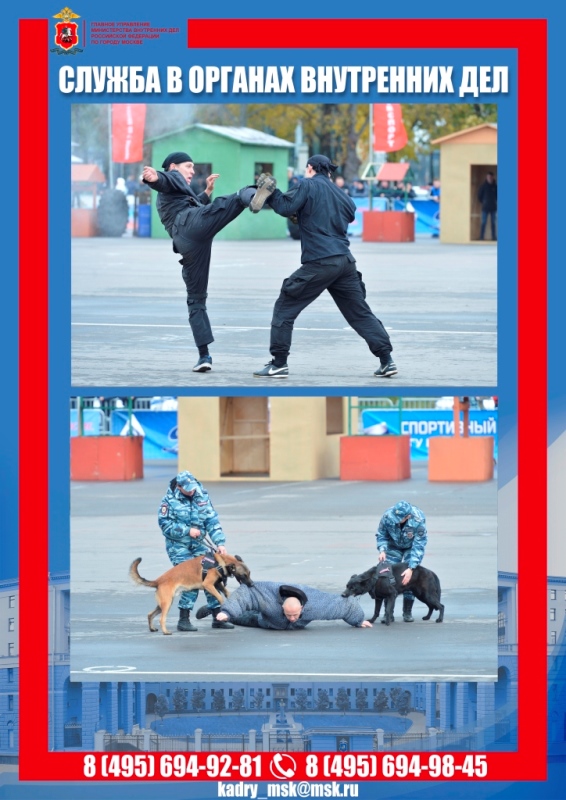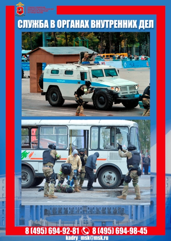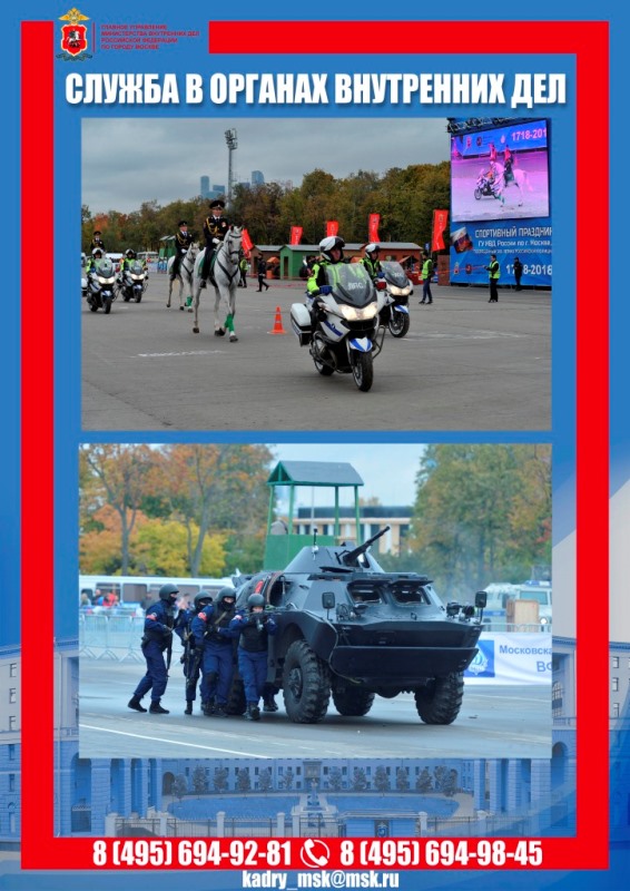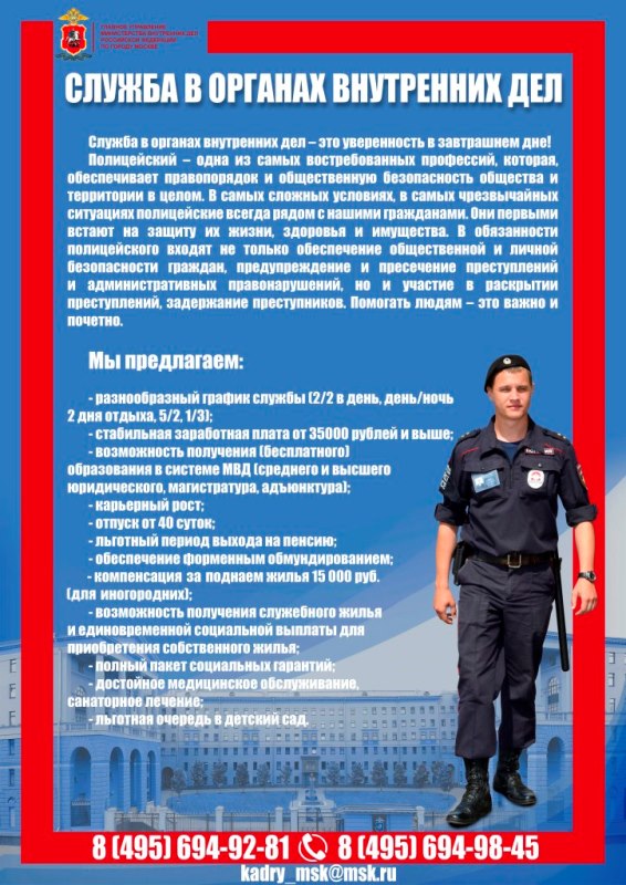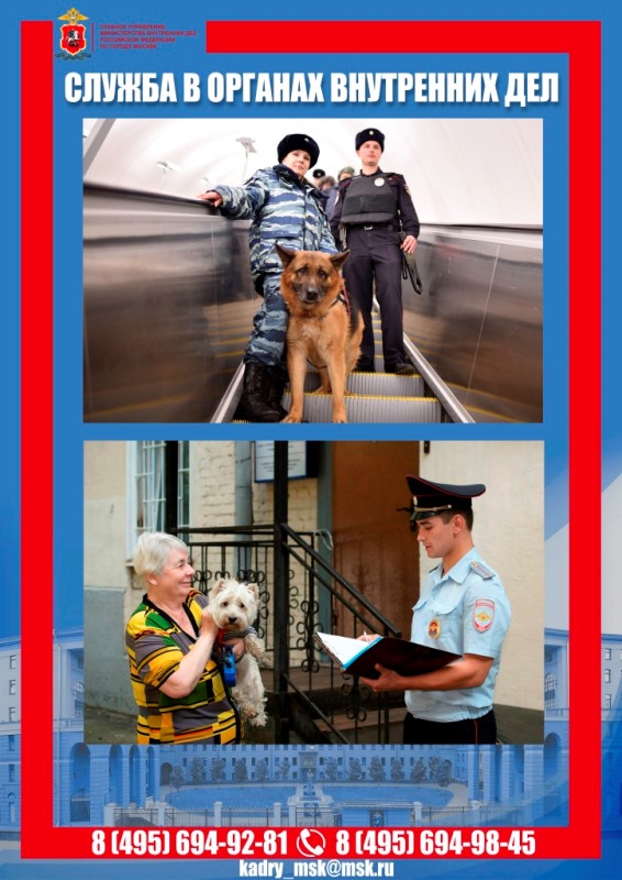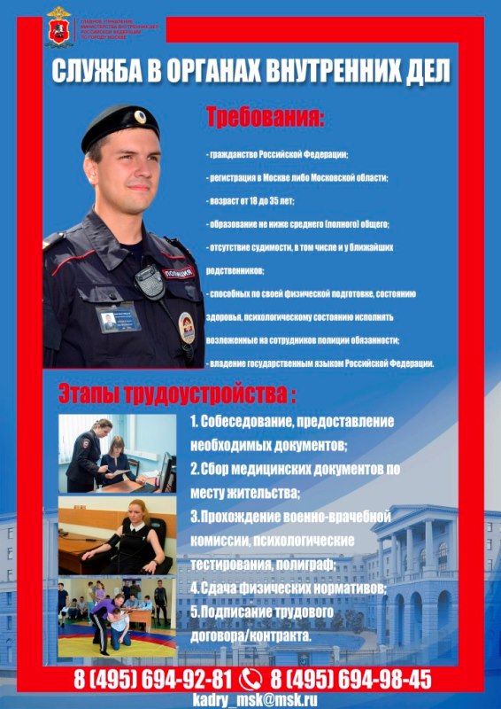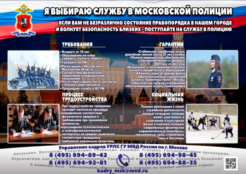 ГУ МВД России по г. Москве приглашает на службу в полицию граждан РФ от 18 до 35 лет, имеющих регистрацию в столице или Подмосковье и годных по состоянию здоровья.