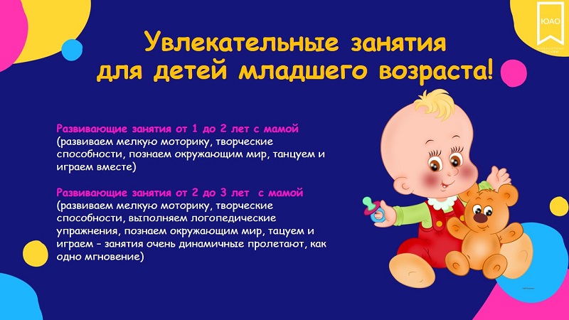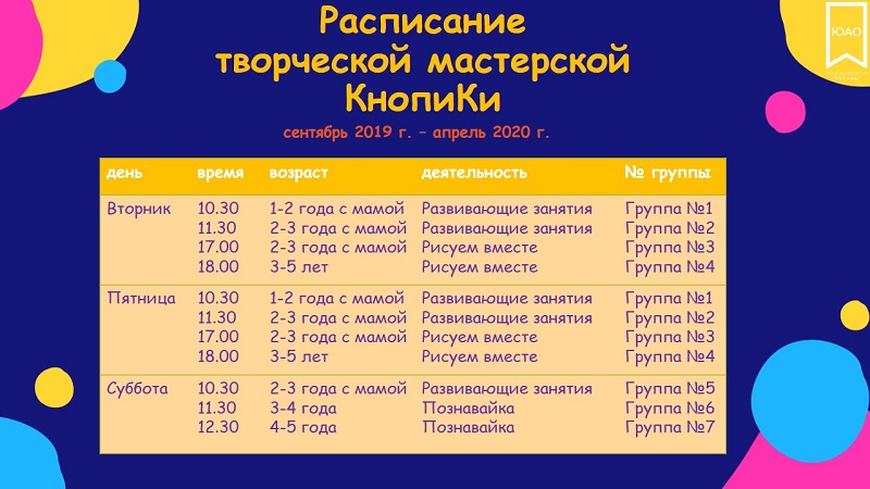 С сентября планируется проводить развивающие занятия для малышей — три разу в неделю — и разделить их на три группы. Так, первая группа детей от одного до двух лет будет заниматься со вторника по пятницу; начало уроков — в 10:30. У второй — встречи будут проходить в те же дни, но начинаться они будут на час позже, в 11:30; это удобно для тех, кто не ходит в детский сад или посещает группу кратковременного пребывания в послеобеденное время.