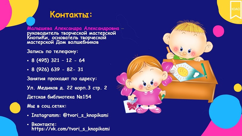 По всем вопросам можно обращаться к руководителю творческой мастерской — Александре Малышевой: 8 (926) 639-82-31.