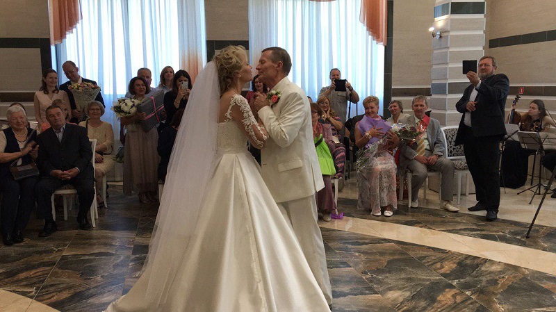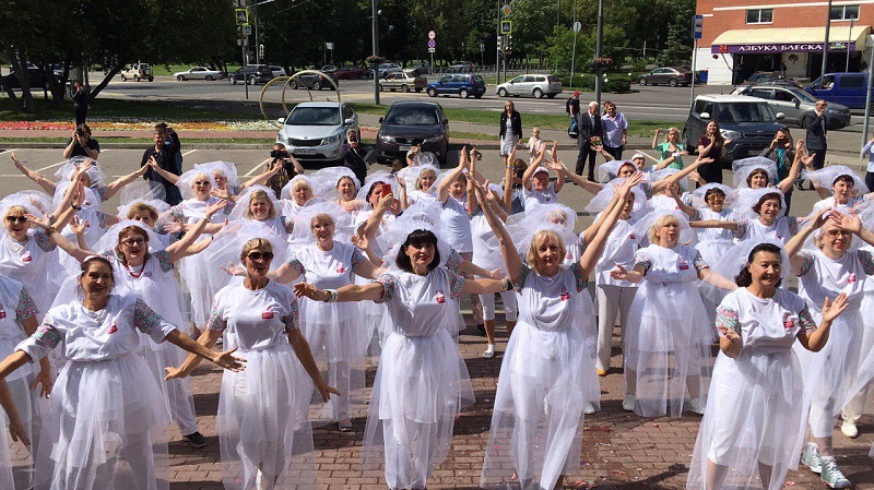 После церемонии бракосочетания у крыльца ЗАГСа молодоженов встретили целых 59 «невест» в фате. Вместе со своей идейной вдохновительницей — самой главной невестой — они станцевали зумбу. Представитель «Интеррекорда» Влад Копылов зарегистрировал мировой рекорд — «Самый массовый свадебный танцевальный флешмоб участниц 55+ в фате»: теперь достижение есть в книге рекордов России.