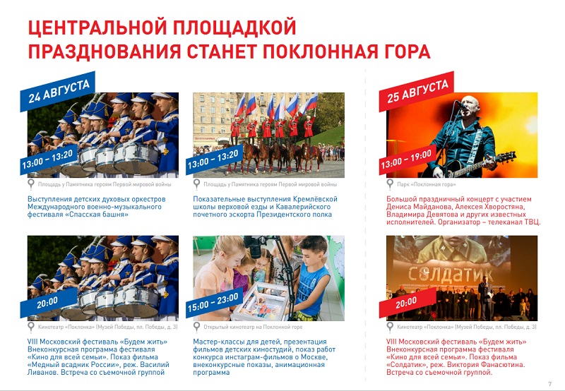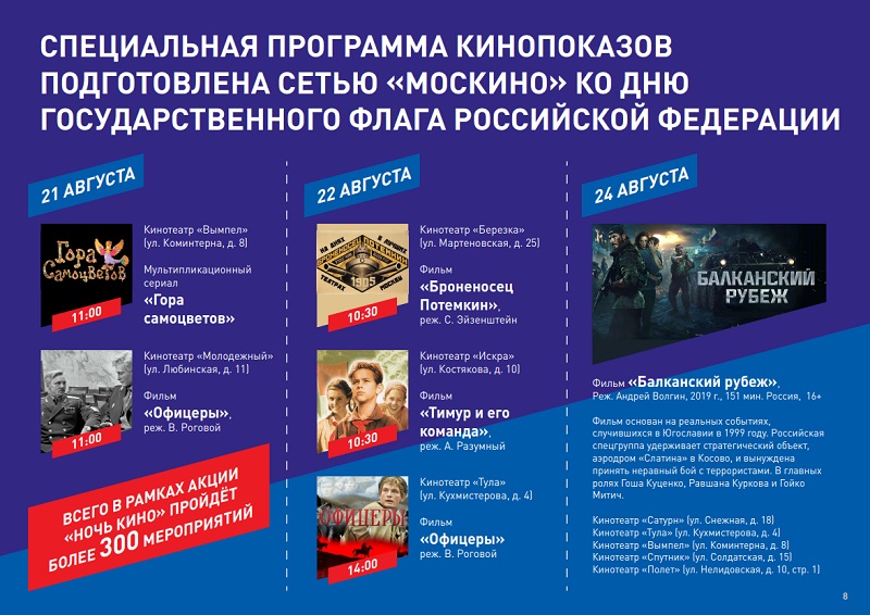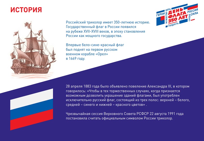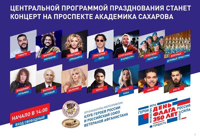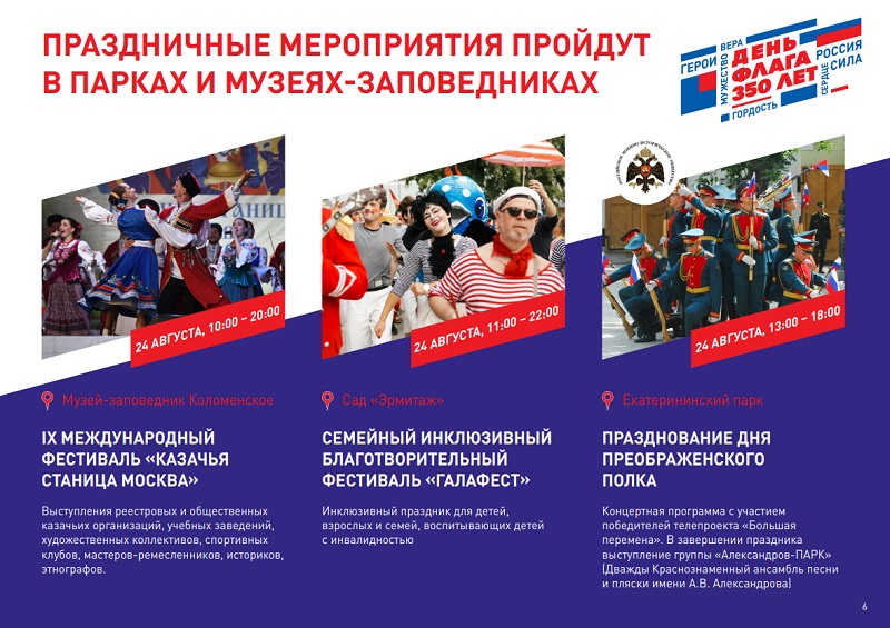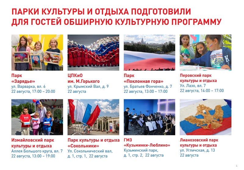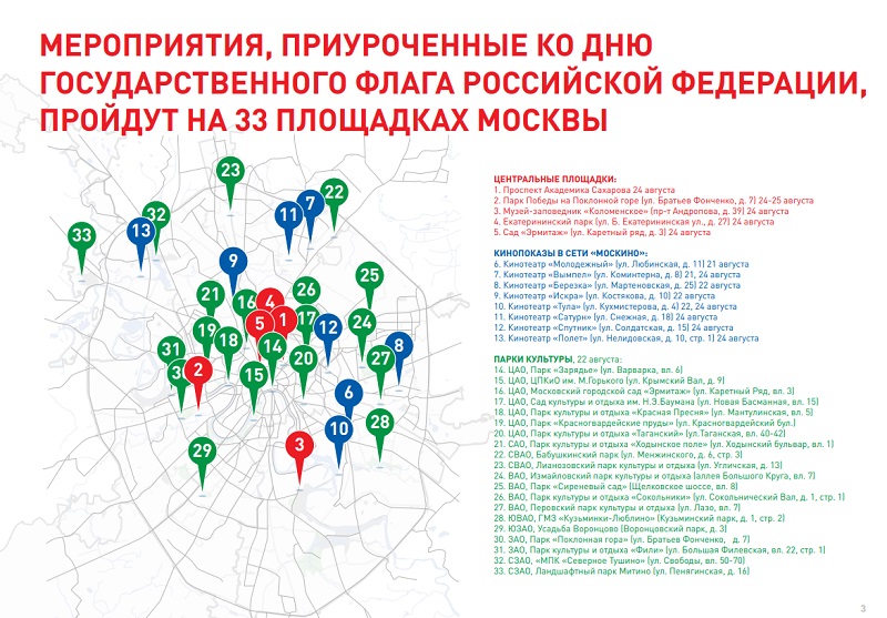 В этом году праздник особенный, так как российскому триколору исполняется 350 лет — концерты, флешмобы и квесты состоятся в парках, скверах и на центральных улицах Москвы. Тематические кинопоказы пройдут в целом перечне кинотеатров. Подробнее с городской программой можно ознакомиться на Официальном сайте Мэра и Правительства Москвы.