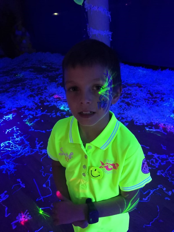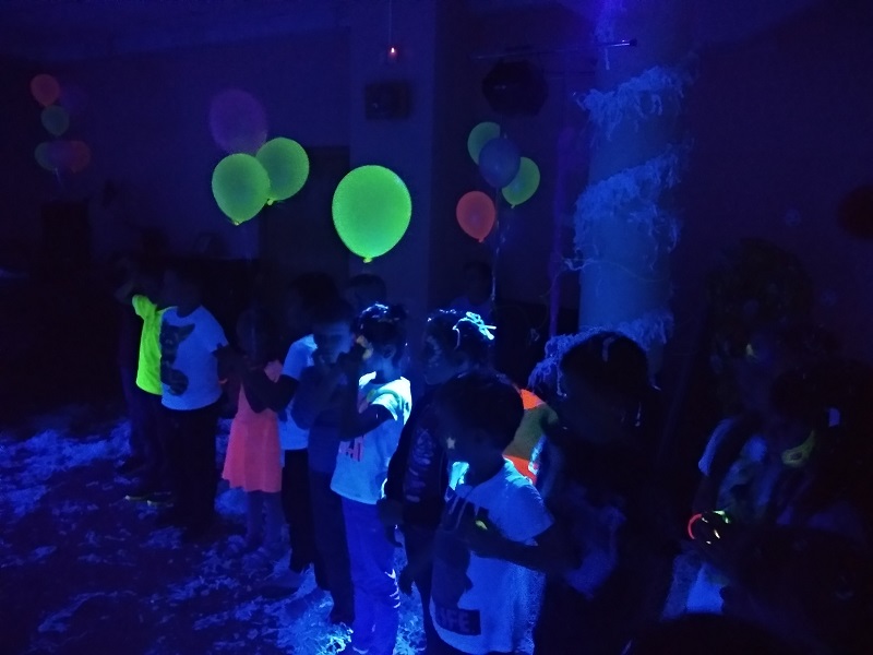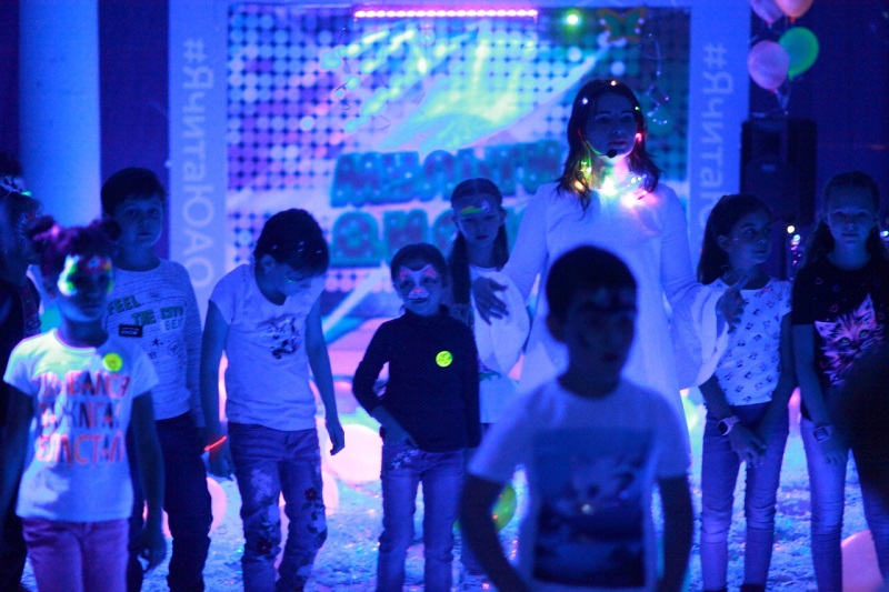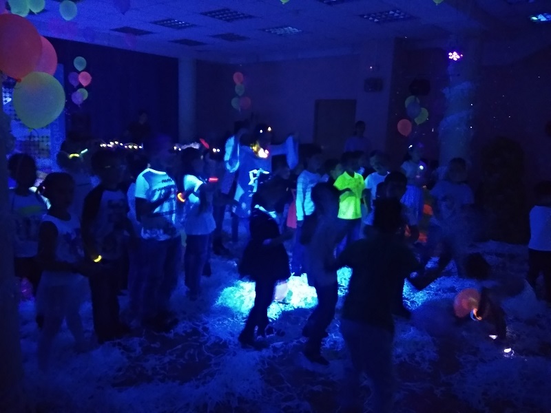 Свыше трех десятков юных танцоров два часа зажигали под музыку в «ультрафиолетовом измерении». Для пущего веселья и создания праздничного настроения перед началом мероприятия каждый желающий смог подготовиться к торжеству — мастера украшали лица ребят аквагримом и делали детям неоновые прически.