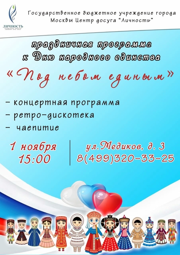 Праздничная программа ко Дню народного единства «Под небом единым» состоится в Центре досуга «Личность» в пятницу, 1 ноября. Об этом журналисту Объединенной редакции интернет-изданий Южного административного округа столицы сообщил представитель Центра Михаил Мартынов.