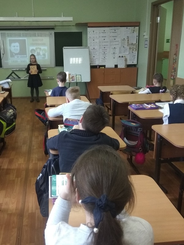 Ведущий библиотекарь Ирина Барашкина рассказала ребятам о биографии и творчестве Виктора Голявкина.