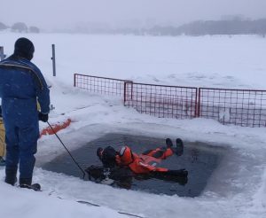 Сотрудники Поисково-спасательной станции «Борисовская» провели для представителей средств массовой информации мастер-класс по спасению людей из ледяной воды. Журналистке предстояло самой выбраться из полыньи. Перед тем как погружаться в воду на репортера надели гидрокостюм спасательный, тщательно проинструктировали, затем показали, как можно самостоятельно выбираться из полыньи и возвращаться на берег.