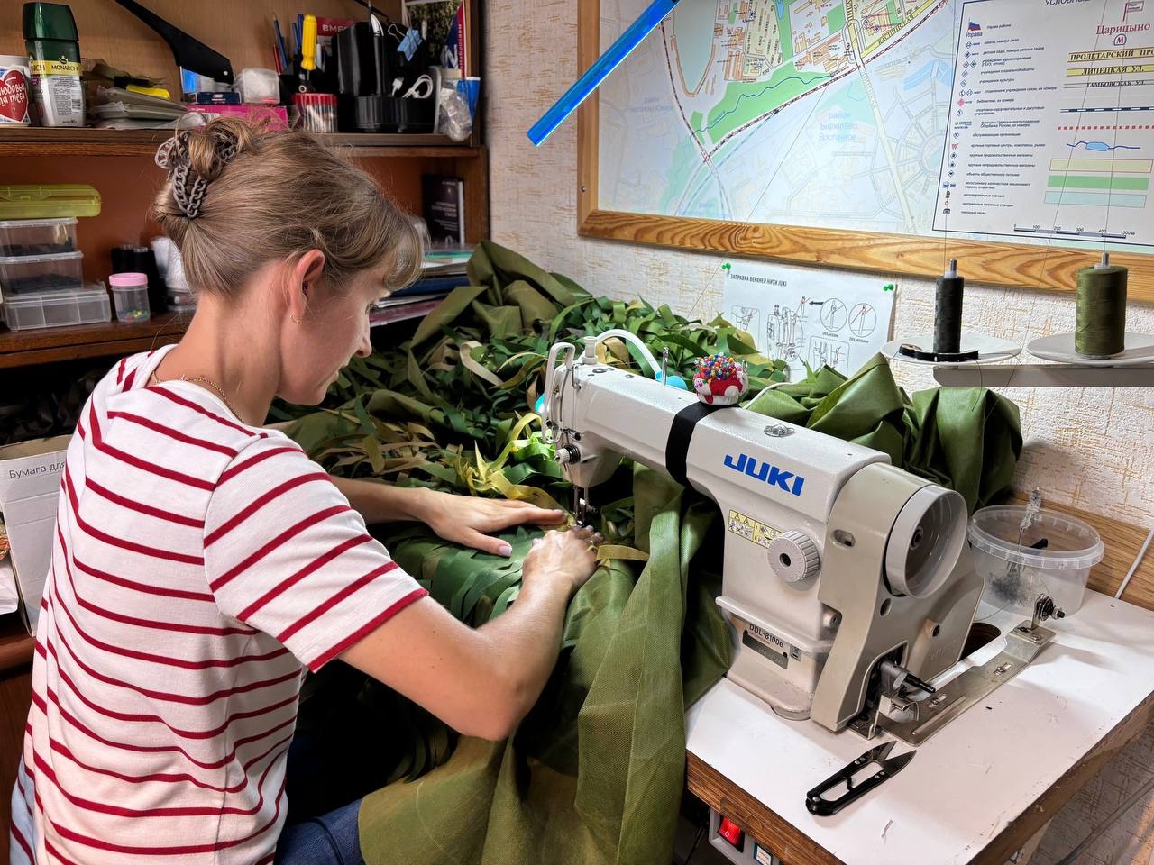В Царицыно волонтерский штаб «СемБат» под руководством Натальи Ермаковой работает без выходных. Помимо плетения маскировочных сетей, добровольцы шьют эвакуационные спальники, нижнее белье и нашлемники для бойцов.